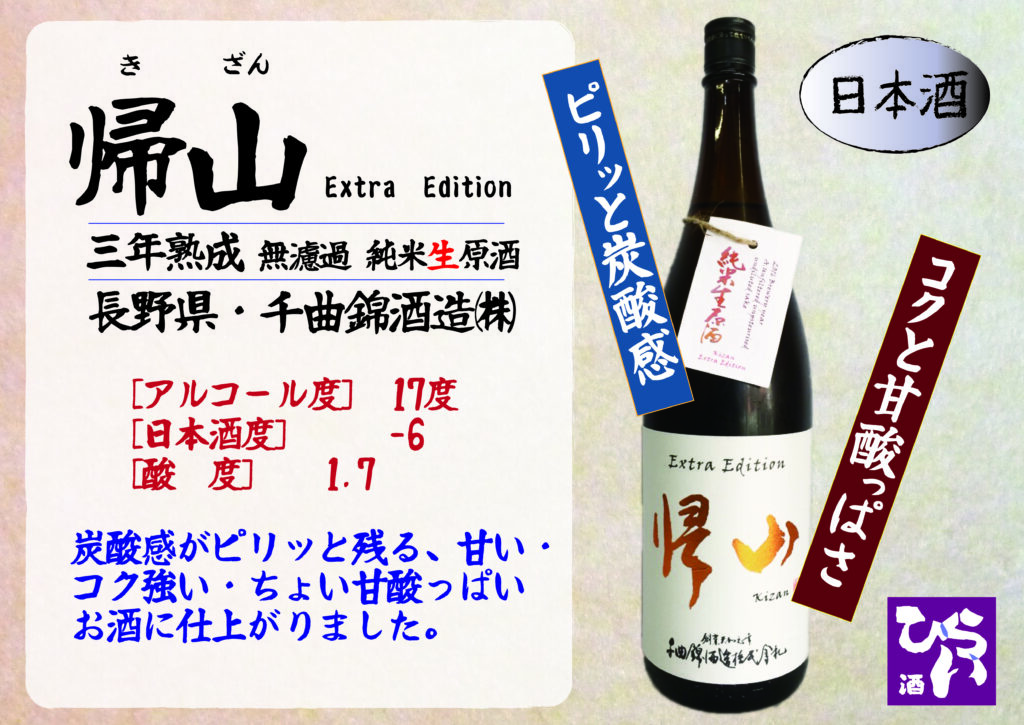 帰山 Extra Edition 三年熟成無濾過純米生原酒 ◎姫路で日本酒・地酒・獺祭・雪の茅舎・獺祭焼酎を買うなら地酒専門の、姫路しののめ『酒ひらい』 by株式会社平井商店