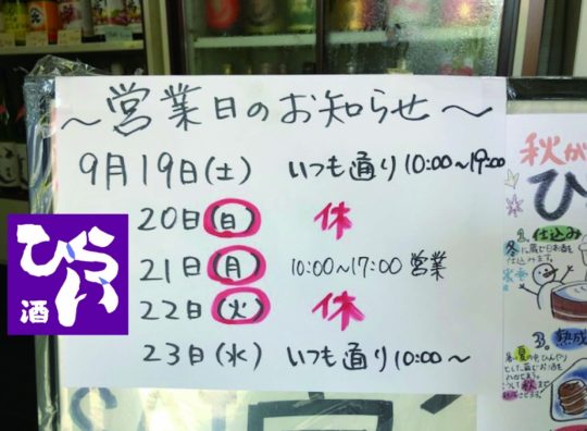 ★シルバーウィーク営業日のお知らせ★ 姫路で日本酒・地酒・獺祭・くまん…