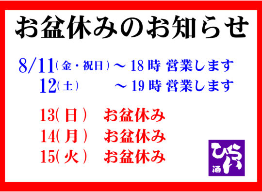 お盆休みのお知らせです。